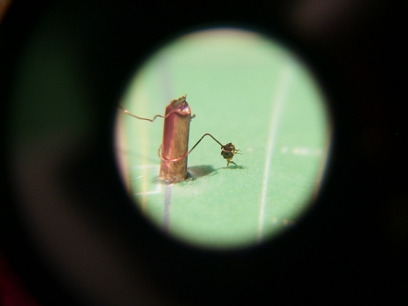 An endoscopic shot of a flea, in a collar, ready to kick a ball on a tiny football field. (And boy did he!!!) |