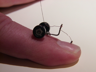 With all the highly magnified shots, few people realize how small a flea is! This live flea, in a collar poses for a photo on my nail. |